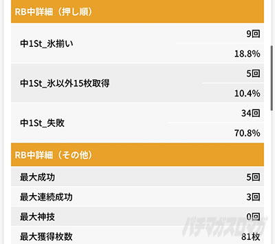 RBの回数は2日目と同様に6回だったのでこの日は明らかに目押しがうまくいっていない。それでも18%なんだから今までとは比べ物にならない成功率ではある。満足できずイラついていることは成長の表れかもしれない。