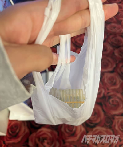 景品交換後に渡された「どこで使うん?」ってサイズ感のスーパー袋はパンッパン♪