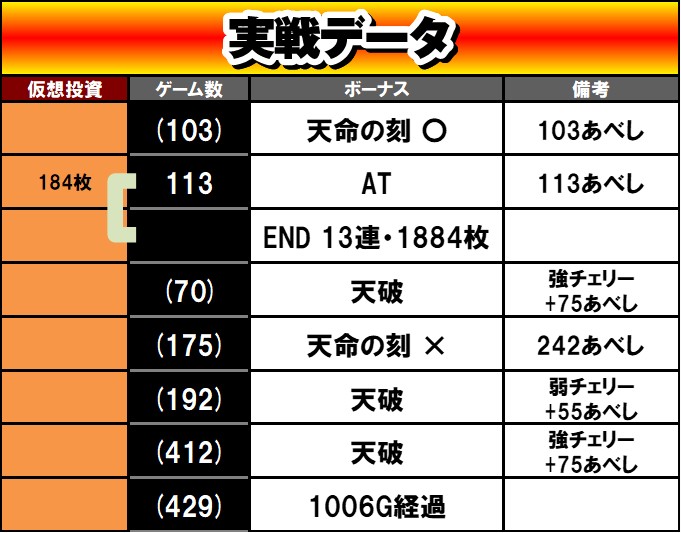 次の当たりを引けぬまま1000G消化となったので推測に関しては全く予想が立ちませんが、一先ず調子良いスタートなので期待も込めて設定E予想としておきます(笑)。