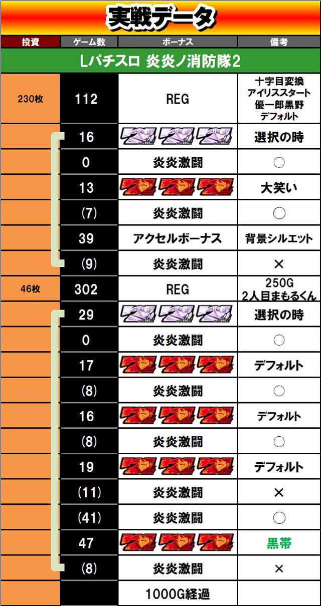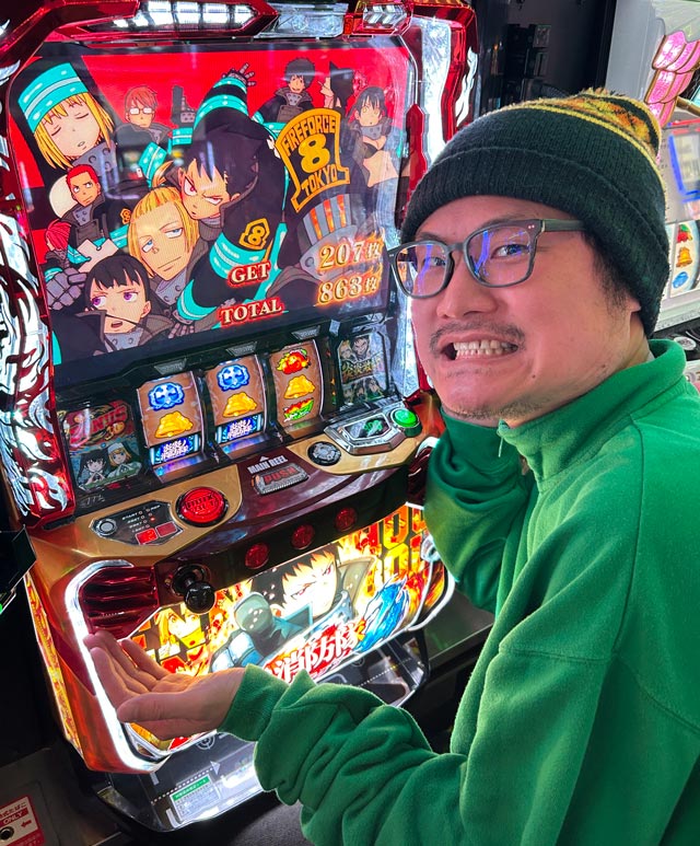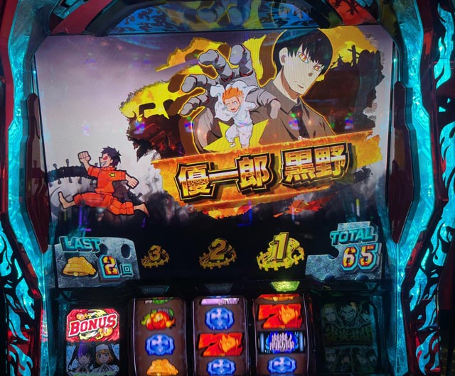 実は深夜実戦で炎炎を打つのは2回目。前は6の3台並びで打ったのだけど、3台中2台は1000Gまでには設定6が確定していた。1台は6確定、もう1台は設定5以上&5否定という具合だ。炎炎はとにかく高設定確定がでやすい。