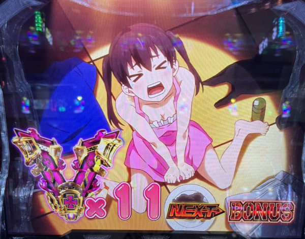 約200枚のボーナスが11個ストック。1ゲーム連でバンバンボーナスが出て来る。純増5.8枚なのでまあ早い。なおこの間はボーナス終了画面が1G連専用のものになるため、設定推測が進まない。ひたすら2200枚を出し切るゲームとなった。