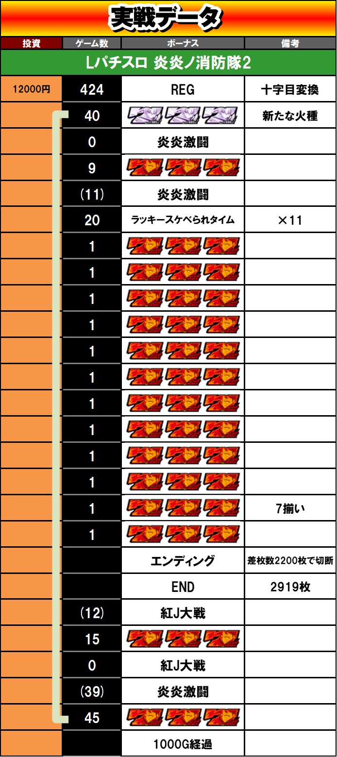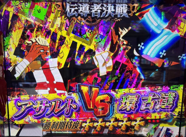 で、今作切断後がめちゃ大事。切断後は通常の炎炎激闘、上位のSTである炎炎大戦、最上位である紅J大戦のいずれかが出てくるのだが、ここに設定差があるらしいのだ。つまり紅J大戦が出てくるかどうかが設定的にも出玉的にも大事だということ。