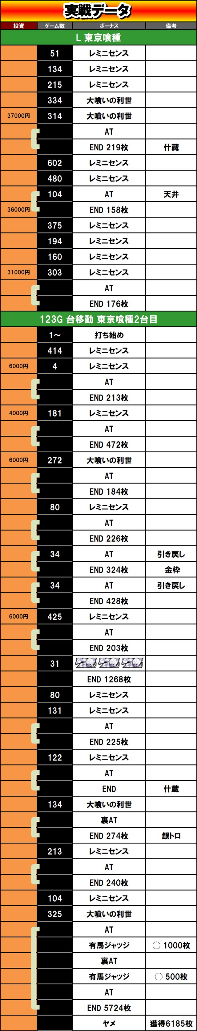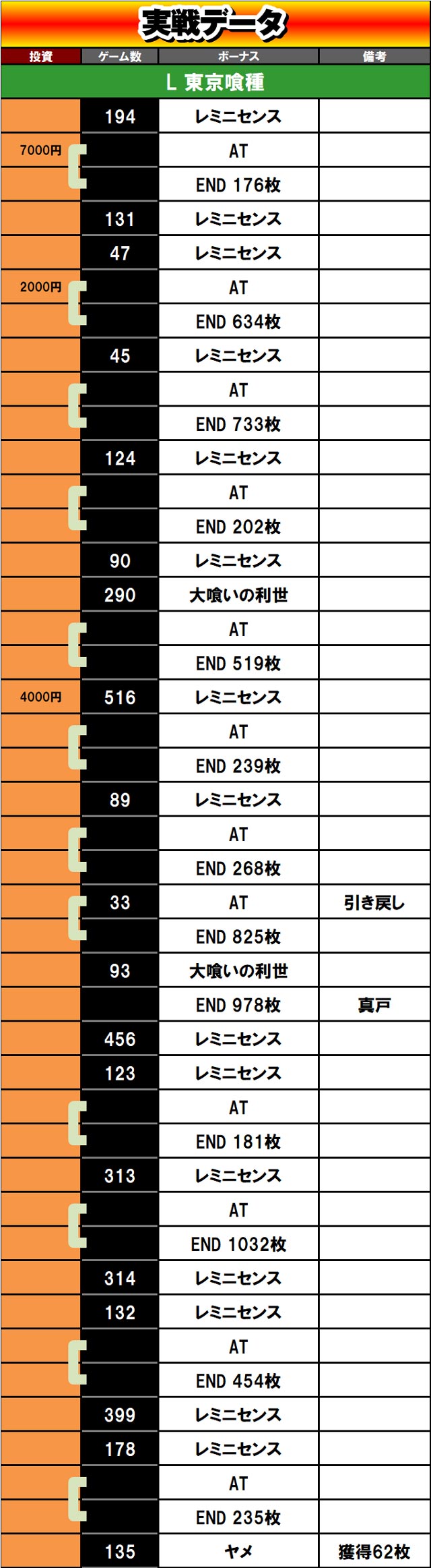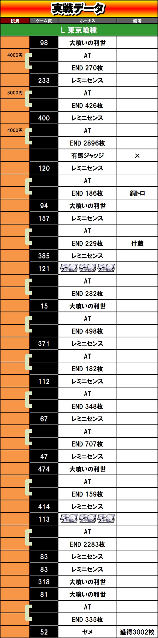 今回はヒノマル用賀店さん(東京都世田谷区)にて実戦。残念ながら抽選で負け、狙っていた化物語は満席。溜まったフラストレーションの吐き出し方が分からないまま、東京喰種の前に座っていた。