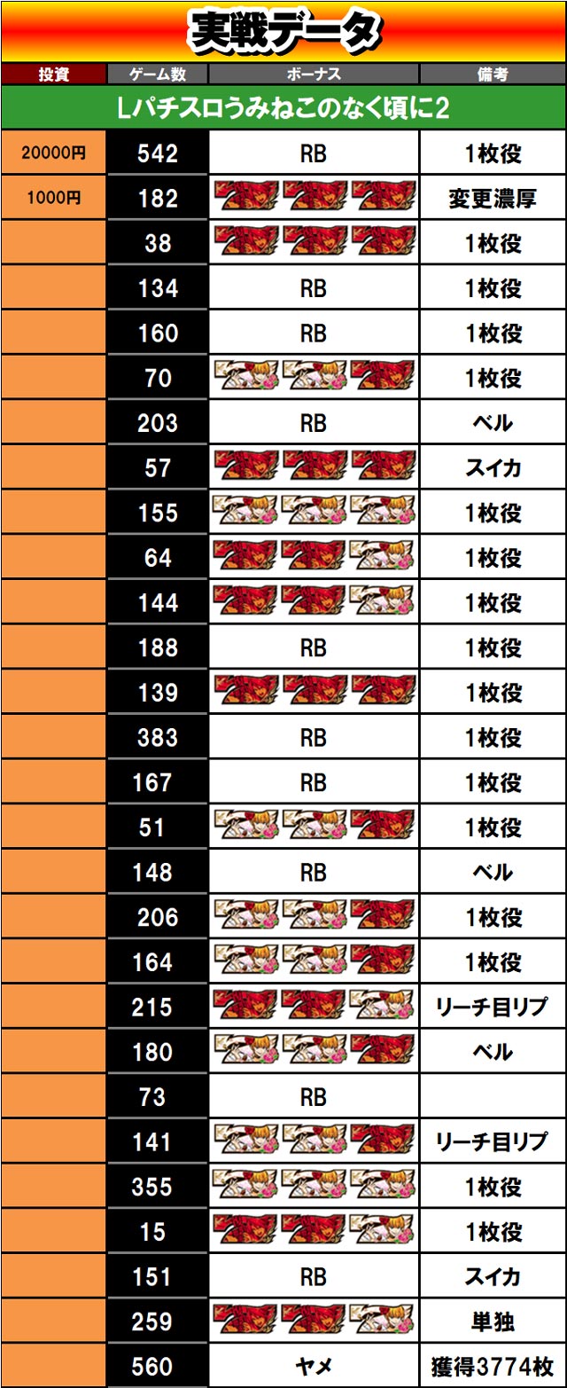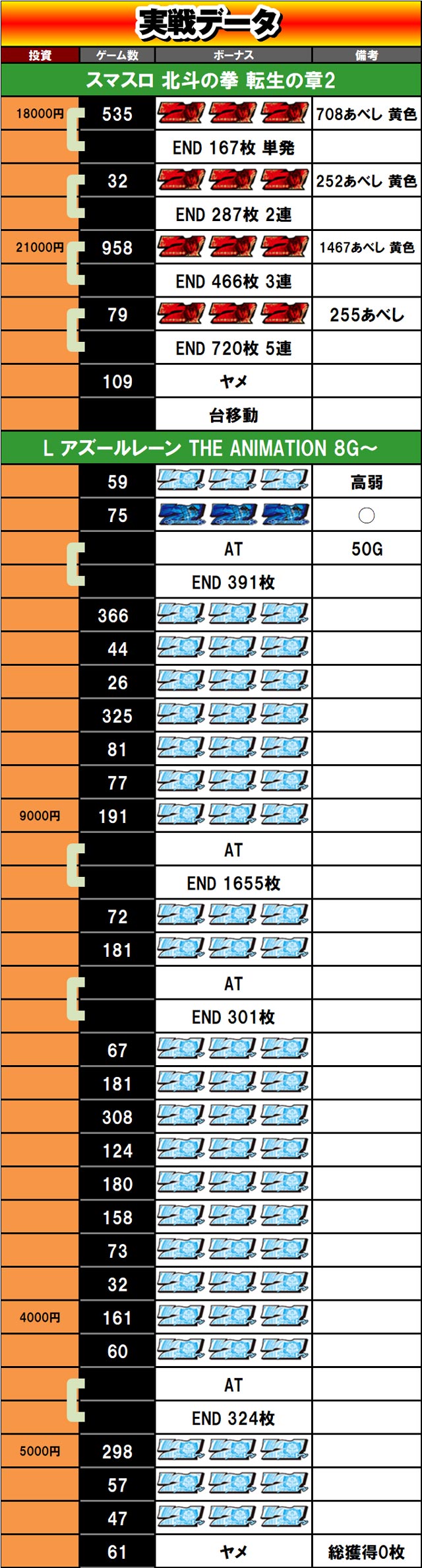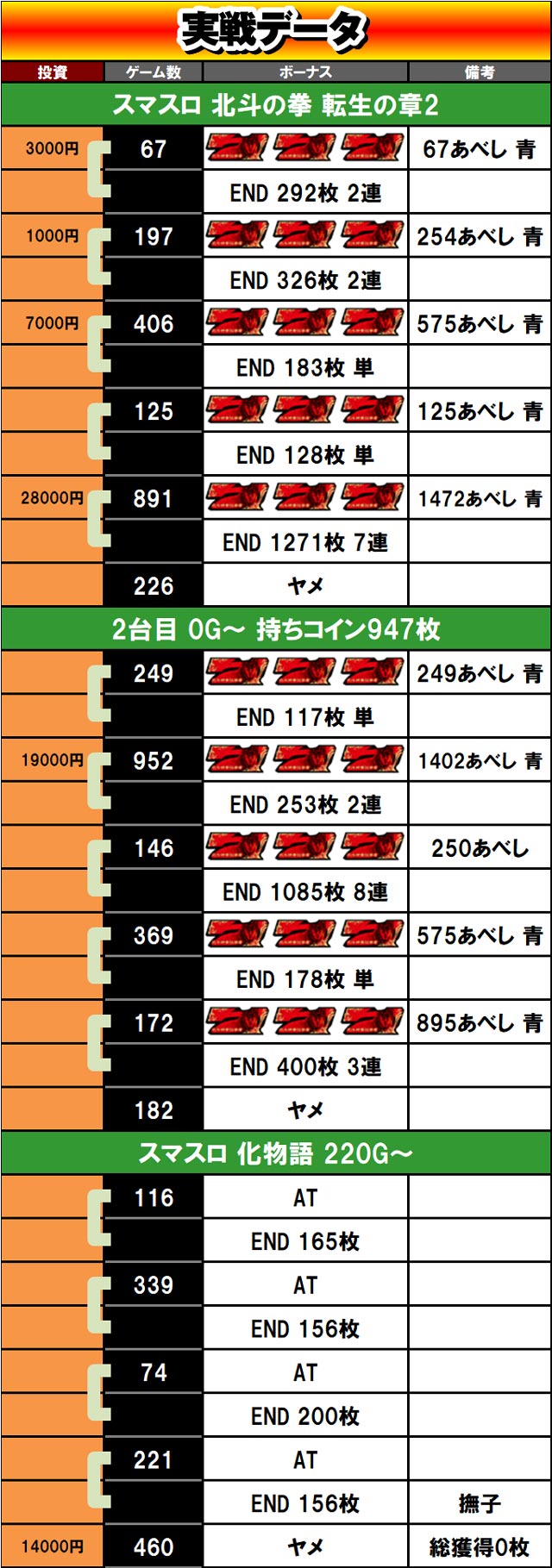しかし早い段階で896あべし抜け、天破もよくないので2台目へと移動。しかし2台目も同じ流れとなり、化物語のシマへと移動…したものの倍々チャンスすらやれずに実戦終了となりました。