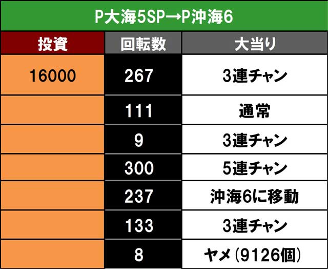 前回は沖海6でかなり優秀台を掴めていたので、今回は新台エヴァ17や暴凶星2などと迷ったが、海コーナーへ突撃し、久しぶりに大海5SPを選んでみたがこれが正解。状況はすこぶる良好で、展開にも恵まれ低投資で持ち玉遊技ができた。最後はこのままハマり続けると遊タイムがチラついてきてしまう回転数となったので急きょ背向かいの沖海6へ移動する。残り時間は1時間弱。その時点でプラスマイナス微妙な持ち玉だったが、何とか滑り込みで2R確変からの3連で勝利を収めた。