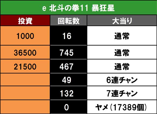 有終の美を飾りたいと選んだのは北斗11暴凶星だ。沖海6の状況もかなり良さそうではあったが、配信トータル収支どマイナスの戦績をコンプリートで巻き返したいとの思いは強かった。それが伝わったのか開始わずか16回転でイキナリフラッシュが発生し大当り濃厚の8テンパイ! これはイケると思いきや、まさかの通常大当り。前のめりになった分、肩透かし感が強く、2度目の当たりもハマって通常。おまけに3回目も通常と投資は瞬く間に6万円目に。だいぶ思惑とは違った展開だったが終了間際に引いた当たりでようやく本日初のRUSHを獲得。しかし4500個の塊含む6連で9000個止まり。なんとも締まらないエンディングだなと続行を決意すると130回程度でまたもやRUSHをゲット!これが4500×2の一撃9000個含む7連で一気に差玉プラス域に到達! コンプリートには程遠い状況ではあったが最低限の仕事はできたかと実戦を終えた。