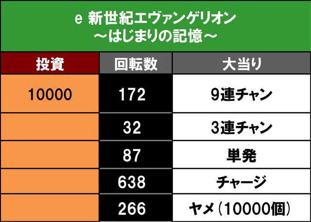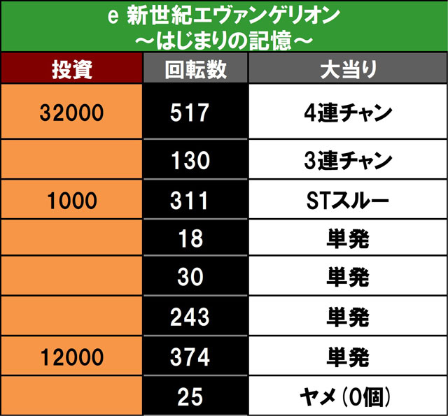 今回の機種も引き続きエヴァはじまりの記憶をチョイスした。前回よりも多い不安の声が溢れる中で実戦を開始するが、スタートダッシュは決められず。人気機種がゆえに多方面から大事故情報が飛び交うのもあり初当りからどこまでもハマってしまう不安はあったが、何とか500回程度で耐えのヒット! これがRUSHに入り4連でハマりを帳消しにしてリスタート。