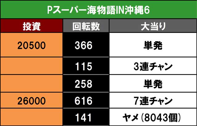 そんな期待と裏腹に、投資は3万円目に突入。これ以上の投資はまずいと思ったところで、何とか本日初の大当りを引くもここは通常。しかし、持ち玉で3連、単発と繋げて前半を折り返す。ここから沖海6特有の数珠連チャンを期待したいところだったが、痛恨の700ハマり。万事休すかと思ったところで遅ればせながらの確変大当り! これが7連まで伸びるも差玉プラスには届かず実戦終了。あと一歩が足りないいつも通りの展開は2025年までにしておきたいところだったなあ。