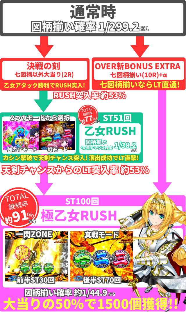 通常時の図柄揃い確率は1/299.2(※1)。七図柄揃いならLTの「極乙女RUSH」に直行! 七図柄揃い以外は決戦の刻(2R大当り)で乙女アタックが発生し、勝利できれば「乙女RUSH」に突入する。トータルRUSH突入率は約53%!!