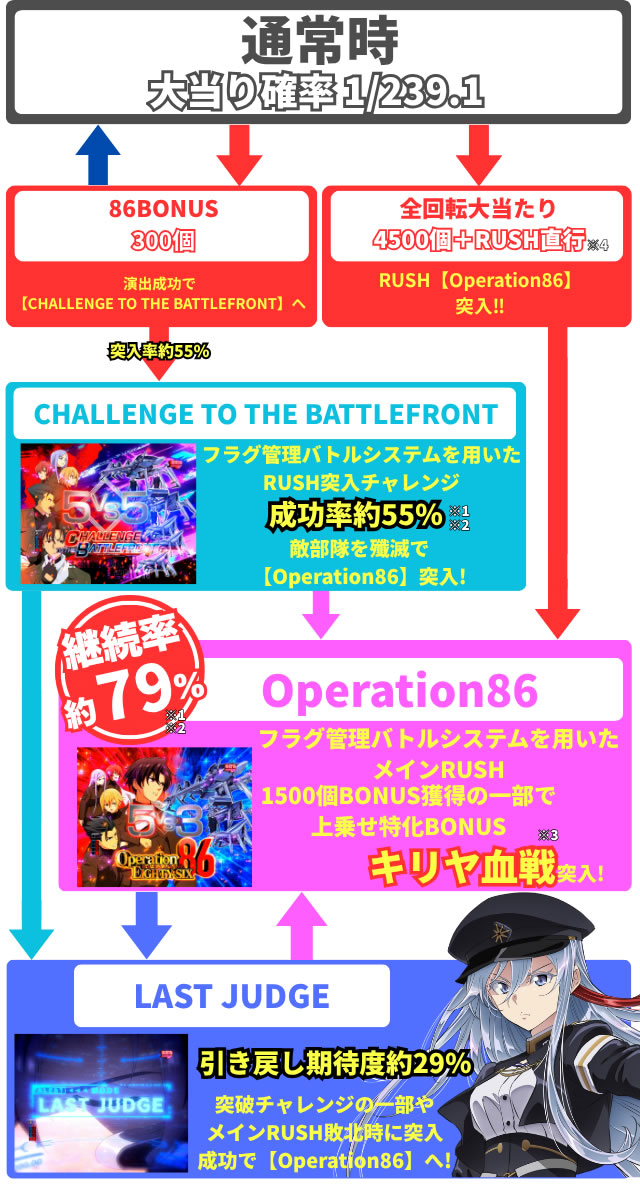 大当り確率は約1/239.1。大当り時の約55%は300個の出玉を獲得し、突破チャレンジとなる【CHALLENGE TO THE BATTLEFRONT】へ。約45%の通常を引いてしまった場合は、300個の出玉を獲得後に通常時へと移行する。約0.5%の振分で4500個※1獲得後にRUSH【Operation86】へと突入する当りが存在する。突破チャレンジ