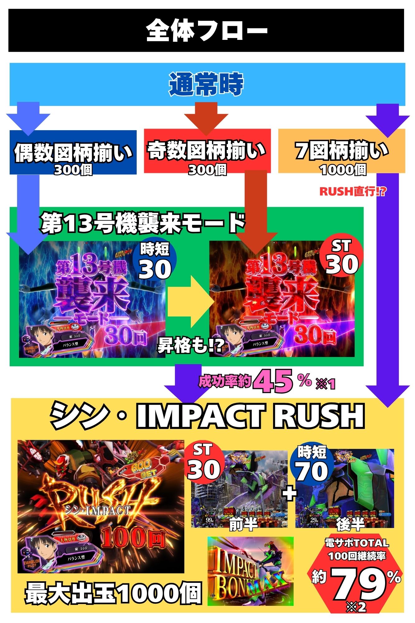 前半ST30回+後半時短70回から成るRUSHは電サポTOTAL100回継続率約79%(※2)、最大出玉は約1000個だ!!