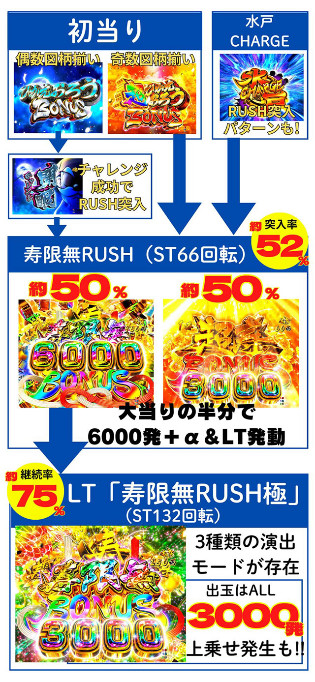 ゲーム性はかなりシンプル。初当り時の約52%で下位RUSHであるST66回転の「寿限無RUSH」へ突入。そこで約50%の6000発+αボーナスに当選すればLT「寿限無RUSH極」へ!! 「寿限無RUSH極」はST132回転で、継続率は約75%。出玉はほぼ3000発で上乗せが発生すれば6000発獲得できる仕様となっている。