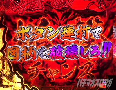 リーチハズレ後の飛猿出現から発展。ボタン連打成功で大当りとなる。
