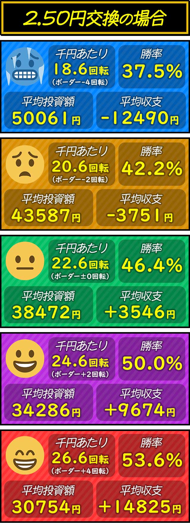 各交換率ごとにボーダー-4〜+4回転を5段階で分けた平均投資額・平均収支・平均勝率を紹介。打つ際の目安として参考にしてもらいたい。