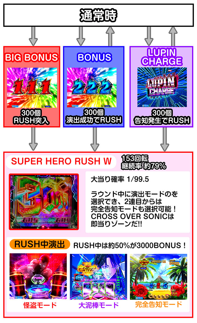 大当り確率が約1/99.9(※4)となる153回転のST。RUSH中当選時の約50%が3000BONUS(※5)となる。継続率は約79%(※5)!!大当りラウンド中に演出モードの選択が可能となっており、初当り時は「大泥棒モード」or「怪盗モード」から選択。2連目以降は最初の53回転が専用の即当りゾーン「CROSS OVER SONIC」となり、100回転目からはさきほどの2つのモードに加え「一発告知モード」が追加された3種類から選択可能となる。