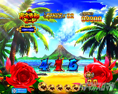 完全告知モードは画面下左右にあるバラが光れば大当り濃厚。予告演出発生でチャンス!