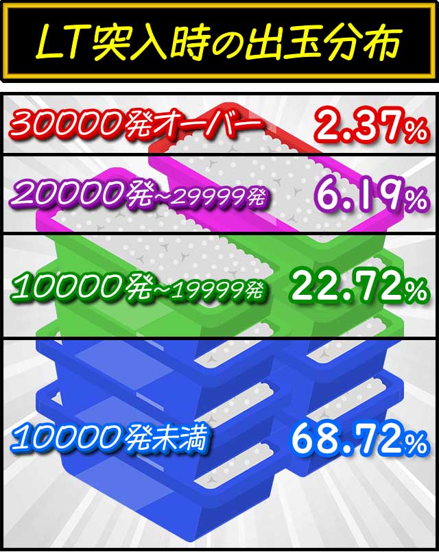 ここでは膨大なシミュレーションで算出されたLT突入時の出玉分布や交換率別の収支分布を紹介。立ち回りや機種選定の参考にしよう。ちなみに本機のLT突入時の性能がコチラ。