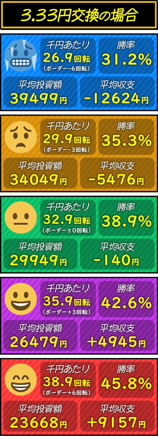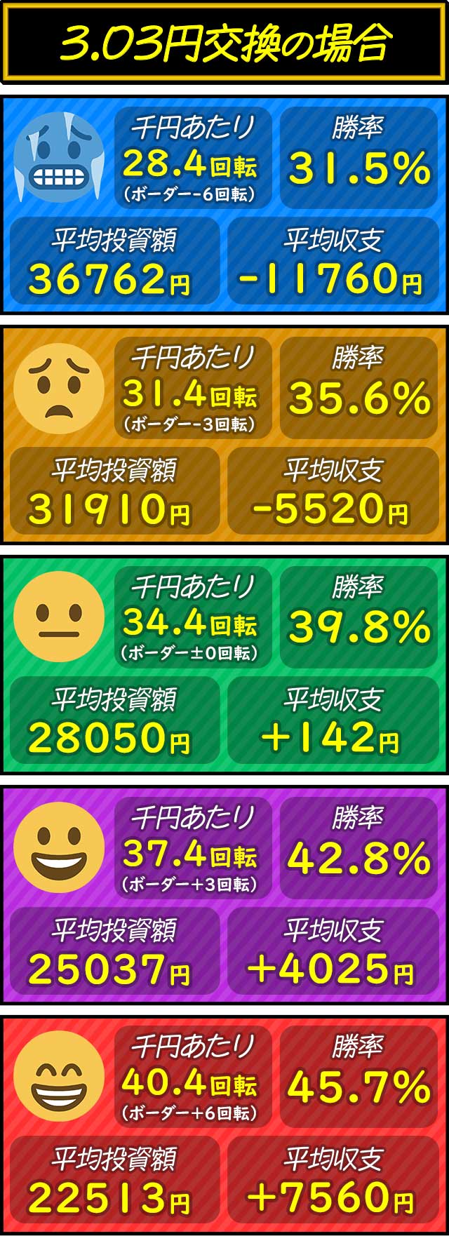 各交換率ごとにボーダー-6〜+6回転を5段階で分けた平均投資額・平均収支・平均勝率を紹介。打つ際の目安として参考にしてもらいたい。