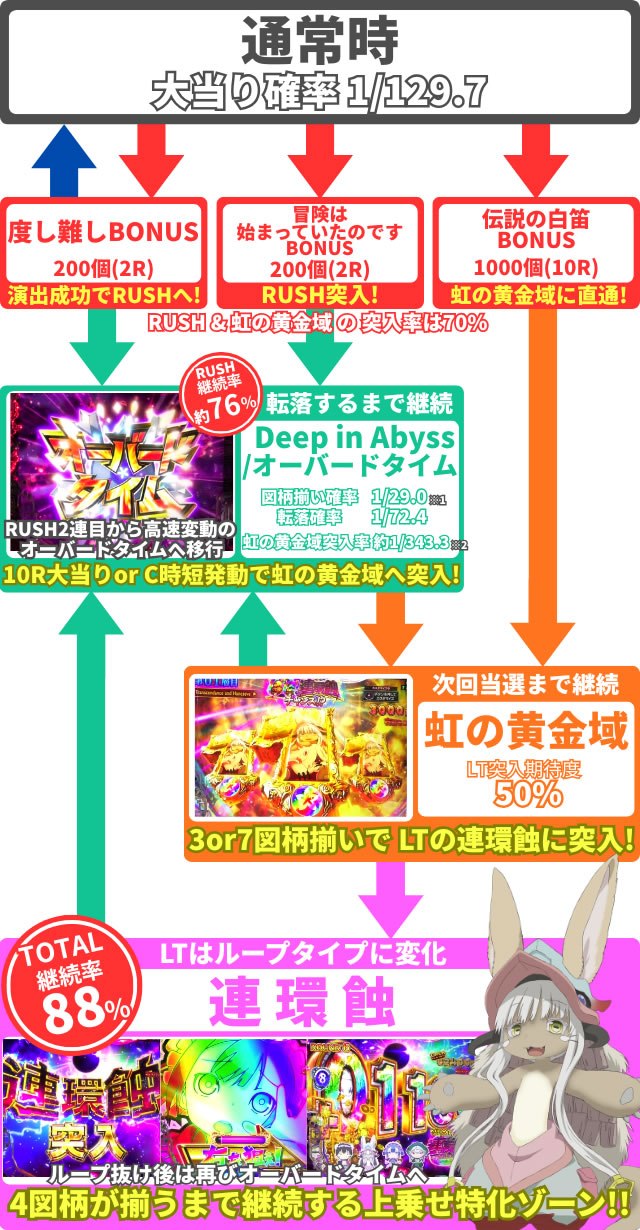 大当り確率は1/29.0(※1)で、RUSH継続率は約76%。転落確率の1/72.4を引くまで継続する仕様となっている。初回RUSH突入時は「Deep in Abyss」から始まり、RUSH中に大当りを引ければ、2連目以降からは高速変動の「オーバードタイム」に移行するぞ。また、RUSH中に10R大当り当選、もしくはC時短が発動すれば「虹の黄金域」へ突入だ!