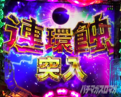 変動中に、停止図柄に4図柄が出現し始めると終了のピンチ。そこから4図柄テンパイ煽りが発生し、揃ってしまうと「連環蝕」は終了となる。4図柄揃い後に復活煽りが発生するので最後まで注目しよう!
