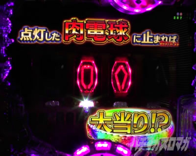 肉電球ギミックが作動する演出。ルーレットで大当りの肉電球ランプに停止すれば演出成功!