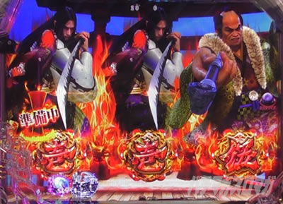左リールに七図柄の座頭市図柄停止で発生する演出。市が七図柄以外の図柄を破壊出来た数だけ七図柄が増殖する。最終的に当該で七図柄がテンパイすれば!?