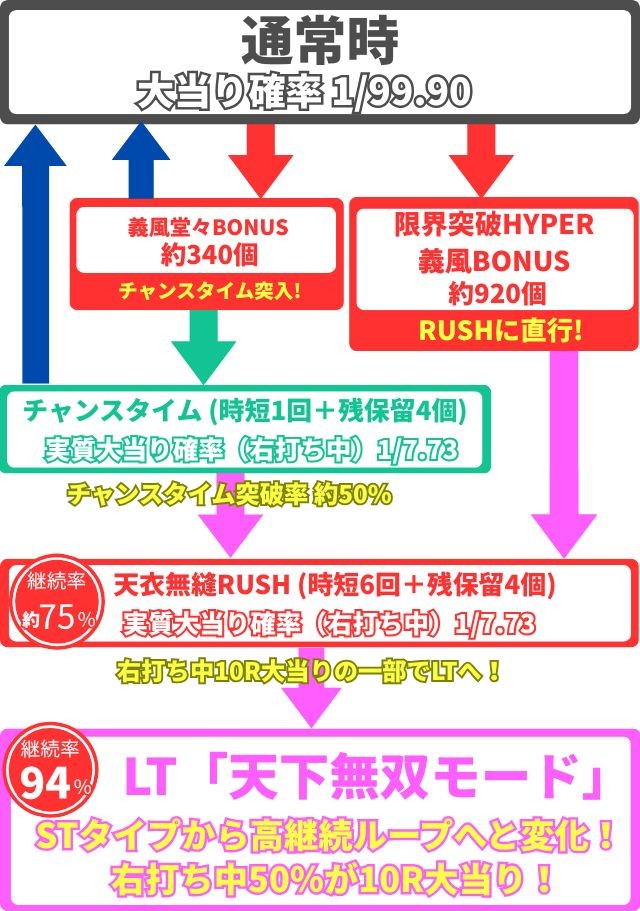 大当り確率が約1/7.73となる時短6回+残保留4回転のST。10Rと4R比率が1:1となっており、1%の振り分けを引くとLT天下無双モードへと突入する。継続率は約75%。