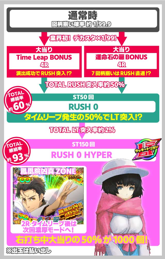 50回転限定のSTタイプで継続率は約60%。右打ち中は当選時の50%が払い出し1000個とデカスタの甘デジながら出玉力も十分。 タイムリープ演出発生時の約1/2(大当り全体の約2%)でLT突入となる。