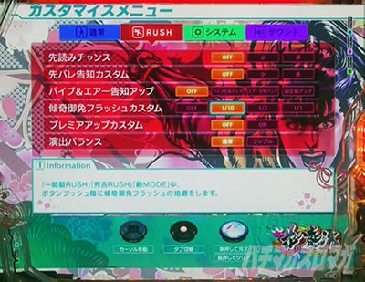 右打ち中は3モード共通で【傾奇御免フラッシュカスタム】も存在。内部的に大当りしている変動でボタンをプッシュすると傾奇御免フラッシュの抽選を行う。大当りしている場合の発生率は1/10、1/2、1/1から選ぶことができる。