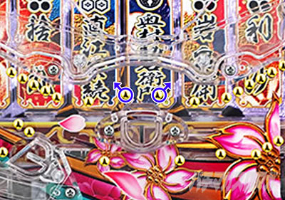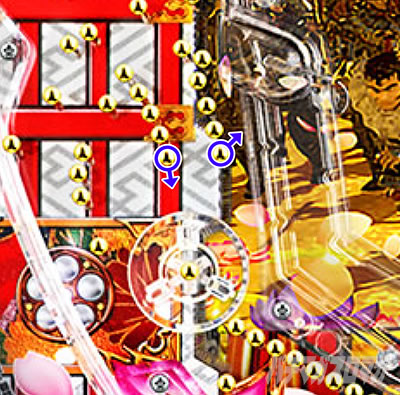 注目すべきは緑のカコミ部分。ここが下や左に向いていると想像以上に風車部分に玉が行かないので要注意。またステージ性能がかなり良い本機においてはワープ部分のマイナスにも注意。