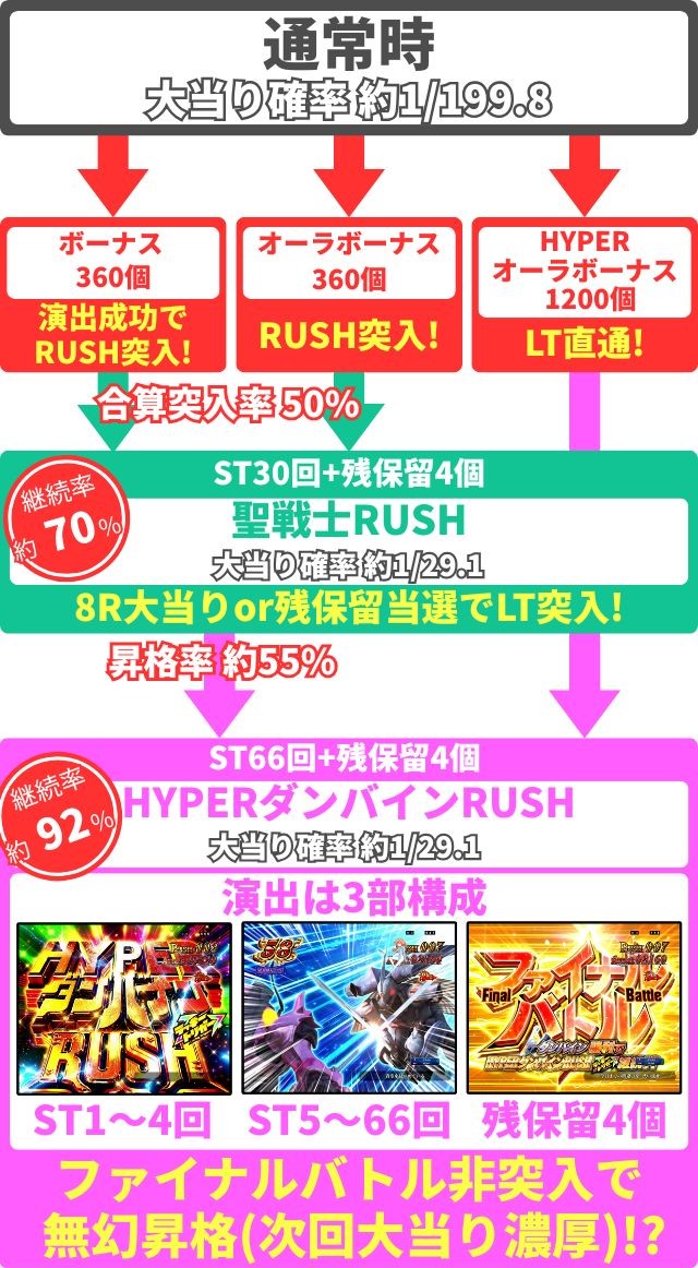 ST30回+残保留4個まで継続するRUSHで大当り確率は約1/29.1。8R大当りに当選するか残保留で大当りすればHYPERダンバインRUSH突入!! 継続率は約70%!