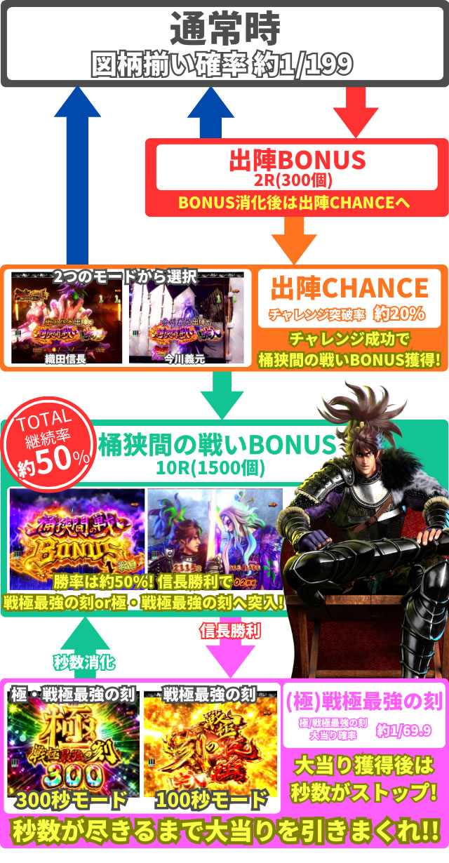 大当り確率約1/69.9で、「100秒間」に大当りを引き続ける限り1500個が何度も上乗せされるBONUS上乗せ特化ゾーン! 大当り獲得後時は時間経過がストップし、ラウンド終了後は残り秒数から再スタートする仕組みとなっているぞ! なお、戦極最強の刻終了後は再び桶狭間の戦いBONUSへ移行するので、最低でも1500個は獲得可能だ! 突入時の獲得期待出玉は約4000個!(※1)