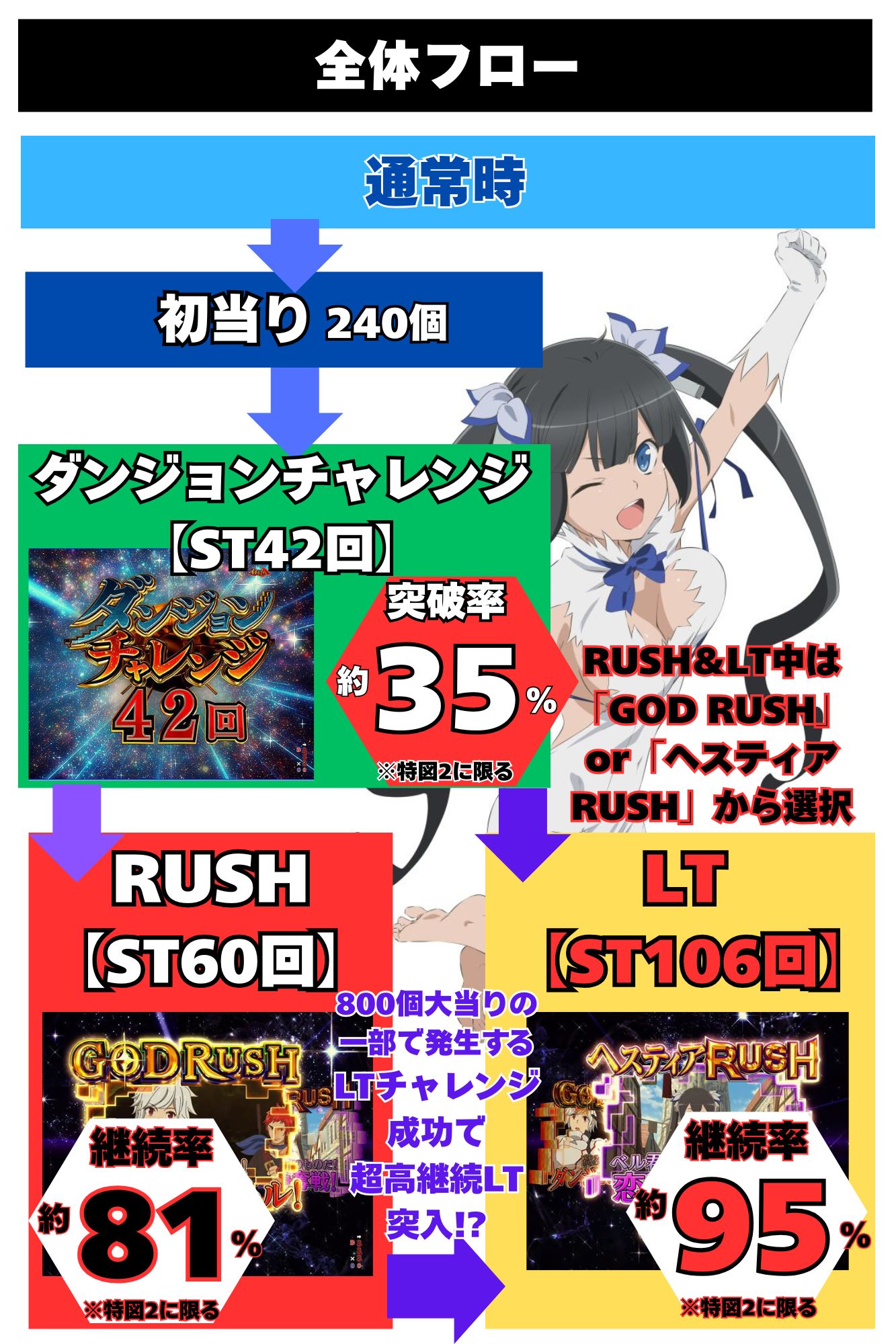 右打ち中の800個(※払い出し)大当りの一部で発生する「LT突入チャレンジ」が成功すればLTへ突入。演出には「神の祝福チャレンジ」と「ヘスティア30面相チャレンジ」があり、後者の方が成功期待度大幅アップ。図柄揃い確率は約1/37.0※1※2。時短106回&継続率約95%※2。RUSH中同様にGOD RUSHorヘスティアRUSHから選択。