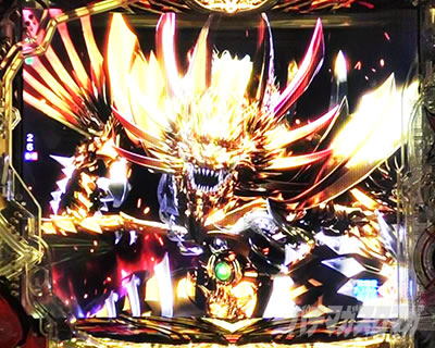 変動中停止時に突如、真滅牙狼が登場するリーチ演出。画面を握りつぶせば魔戒BURSTチャレンジ(大当り)濃厚!