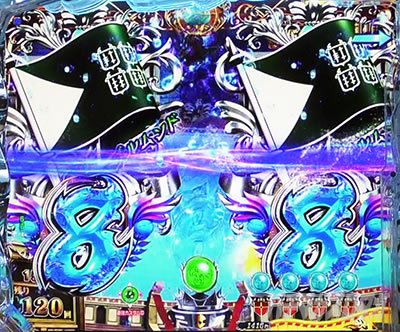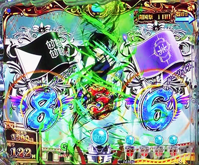 ソーカの掛け声煽り予告は成功で武闘大会リーチ濃厚、中図柄に7が停止すればアルティメットジャッジ、アルティメットジャッジ煽りも成功でアルティメットジャッジ濃厚となる。左右にヴェルドラとルミナスが停止するエンドレスブレインは煽り成功で大当りだ。