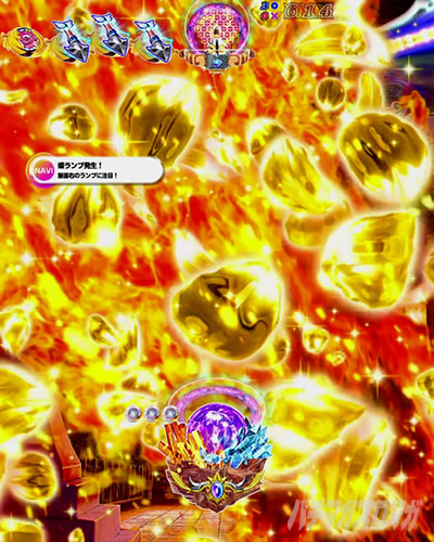 図柄停止時にアタッカー下の燦ランプが点灯する先読み予告。ランプ点灯時はエフェクトに注目。