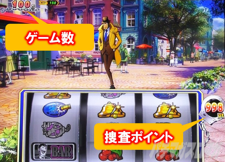レア小役成立時は、捜査ポイントの大幅減算に期待。このポイントは毎ゲーム成立役に応じて減算が行われ、0ptに到達するとCZ抽選が行われる。