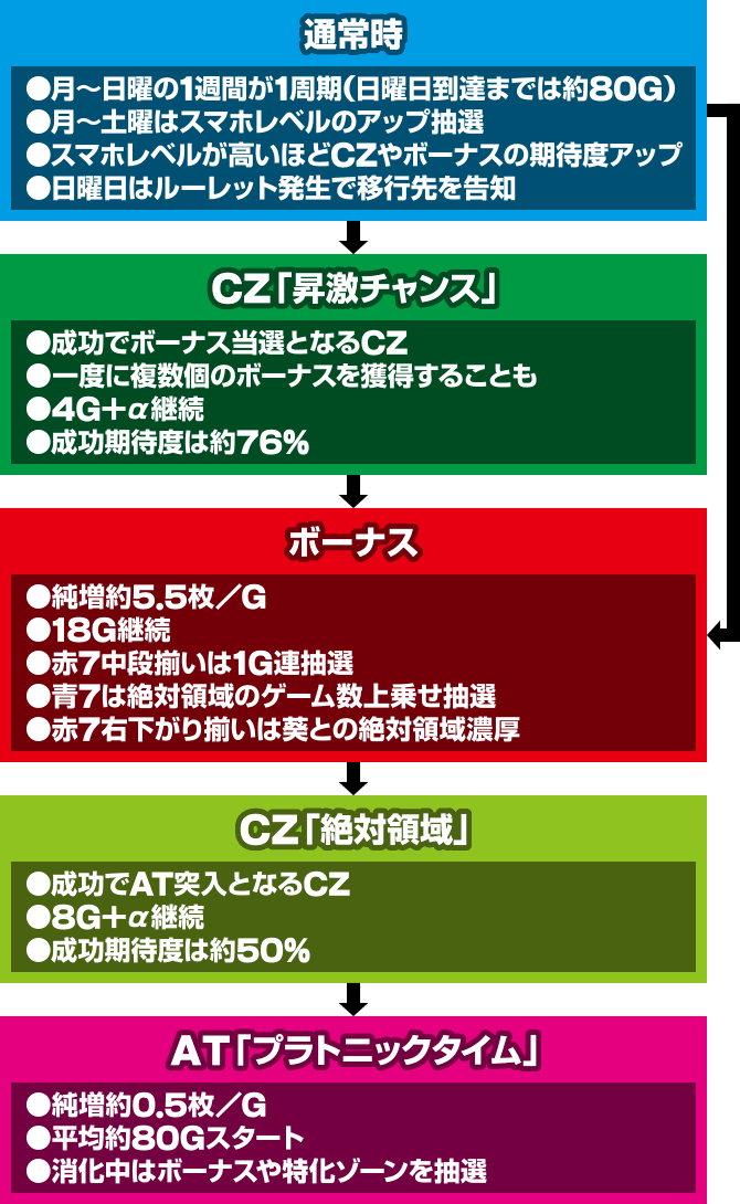 月〜土曜にスマホレベルのアップ抽選が行われて、日曜日にCZや前兆などの移行先が告知される。