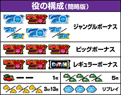 ◆通常時はリーチ目やレア小役からボーナスにつながるシンプル設計で、ノーマルタイプのように楽しめる。初当り確率は1/169.4〜1/131.9(設定1〜6)と軽め!!