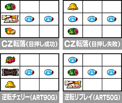 →左リール(中→左で回避失敗した場合は右リール)の上・中段に白7を狙う。停止形によって移行先が決定。