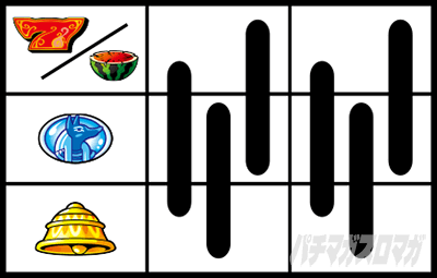 →右リールを適当打ちし、中リールにスイカを狙う(ピラミッド目安)。