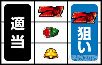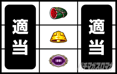 →左リールを適当打ちし、右リールにスイカを狙う(赤7目安)。