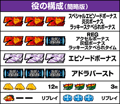 ◆炎炎ループ中のボーナスは炎炎ボーナス=約200枚、アクセルボーナス=約85枚、炎炎ブースト=約550枚の3種類。