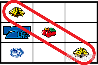 青7狙い時に左リール中段に青7が止まり、右下がりに「ベル・チェリー・ベル」が停止すればピンチ目。